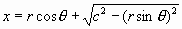 ピストンの位置をx、コンロッドの長さをc、クランクシャフトの半径(つまり、ストロークの半分)をrとします。
